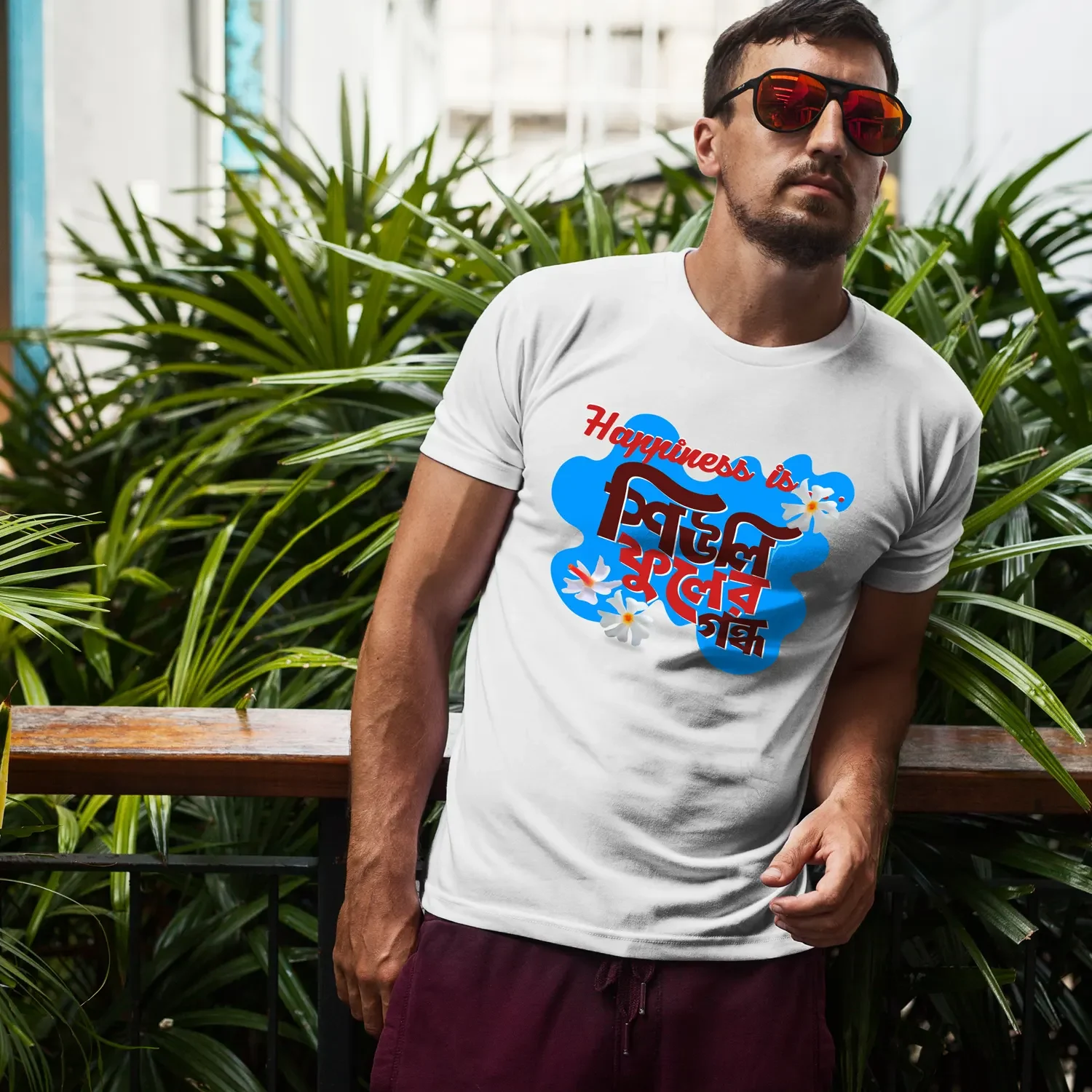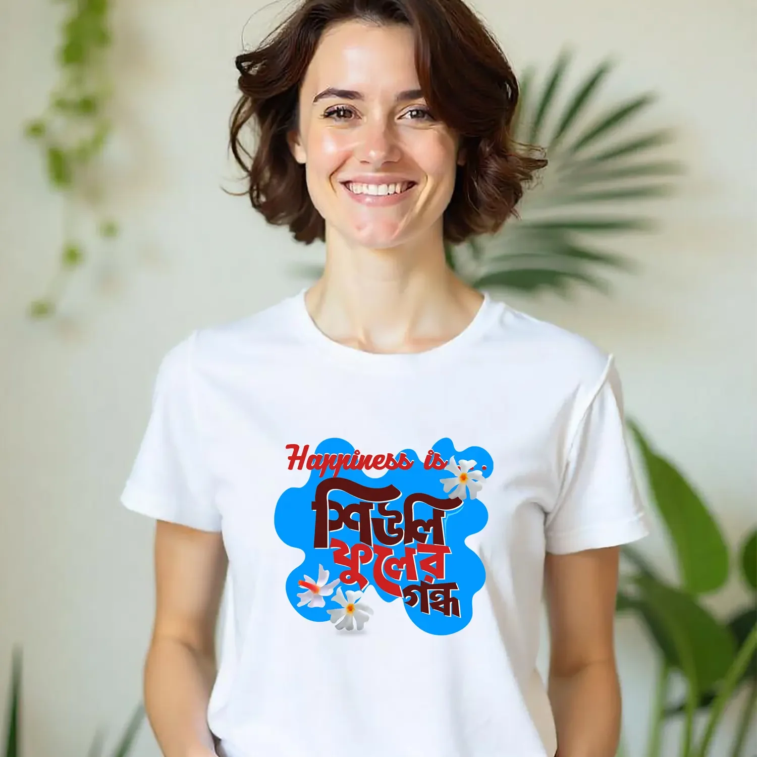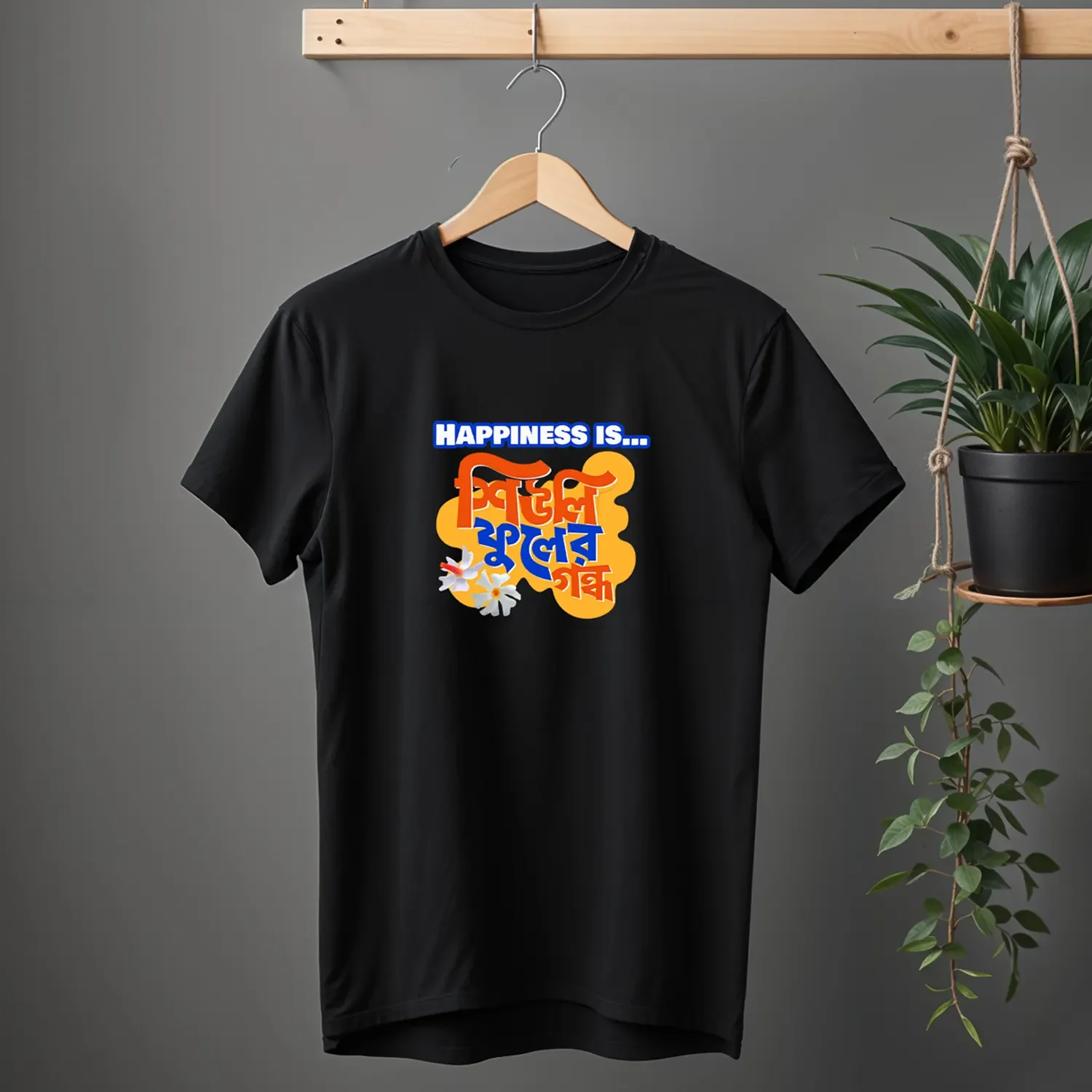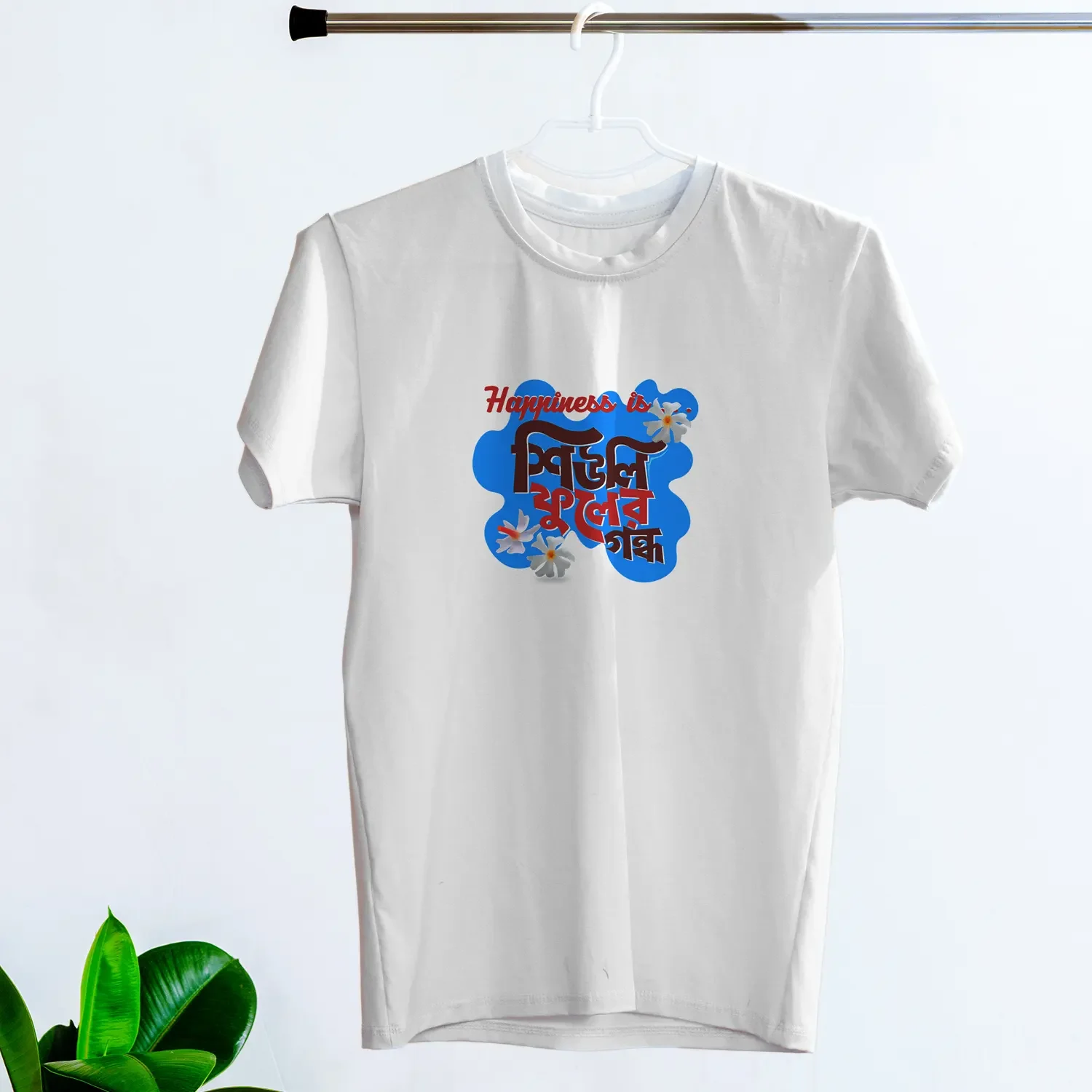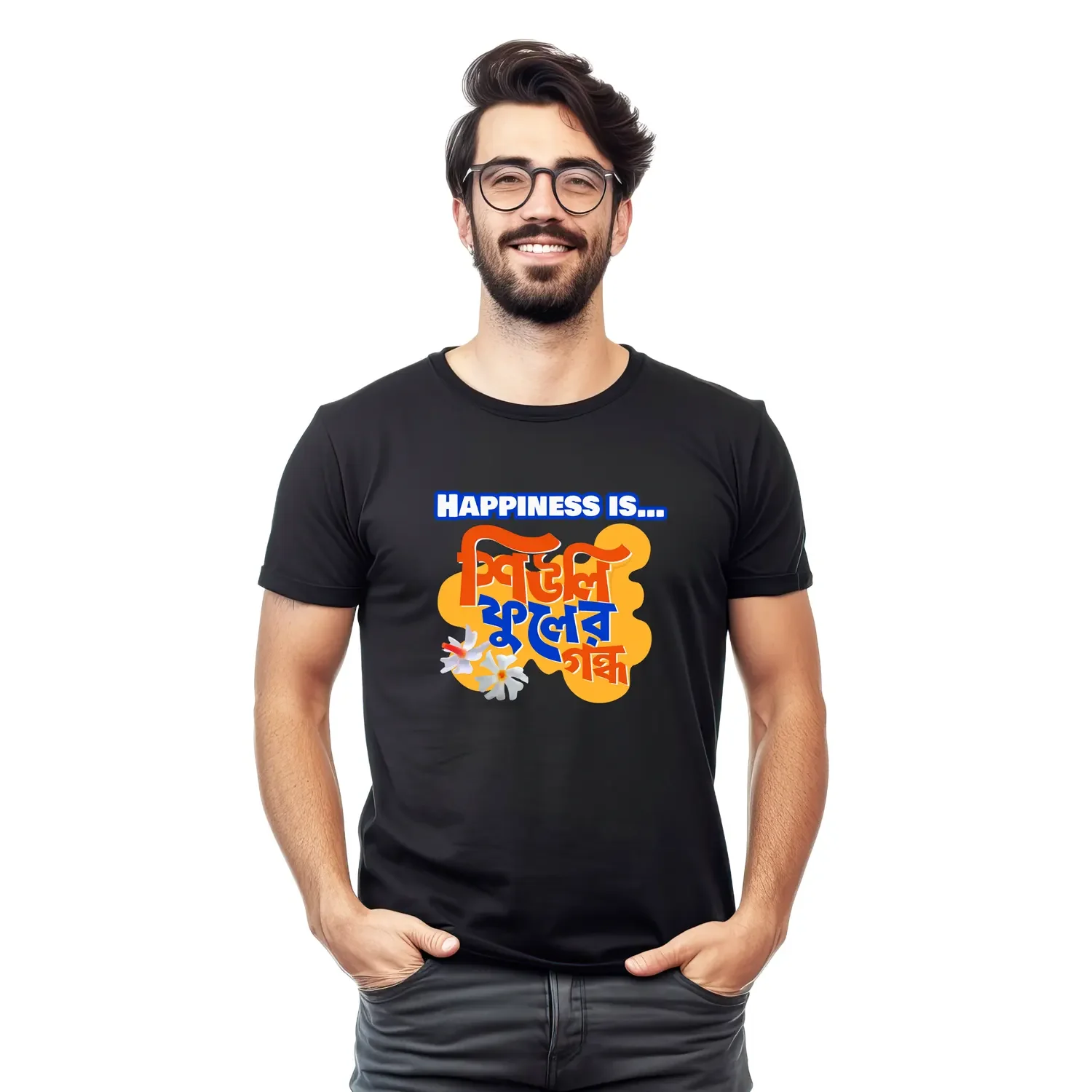 There’s a special kind of joy that blooms only once a year — and it starts with the delicate scent of Shiuli Phool. Our “Happiness is Shiuli Phooler Gondho” T-shirt is a soft, nostalgic tribute to those early autumn mornings, when the air smells like home and Durga Puja is just around the corner. Designed for those who feel the festival in their hearts before it even begins, this tee captures that magical emotion in one line. Printed on premium cotton, it’s perfect for slow walks, Pujo prep, and soul-soothing vibes. Because real happiness? It smells like Shiuli.